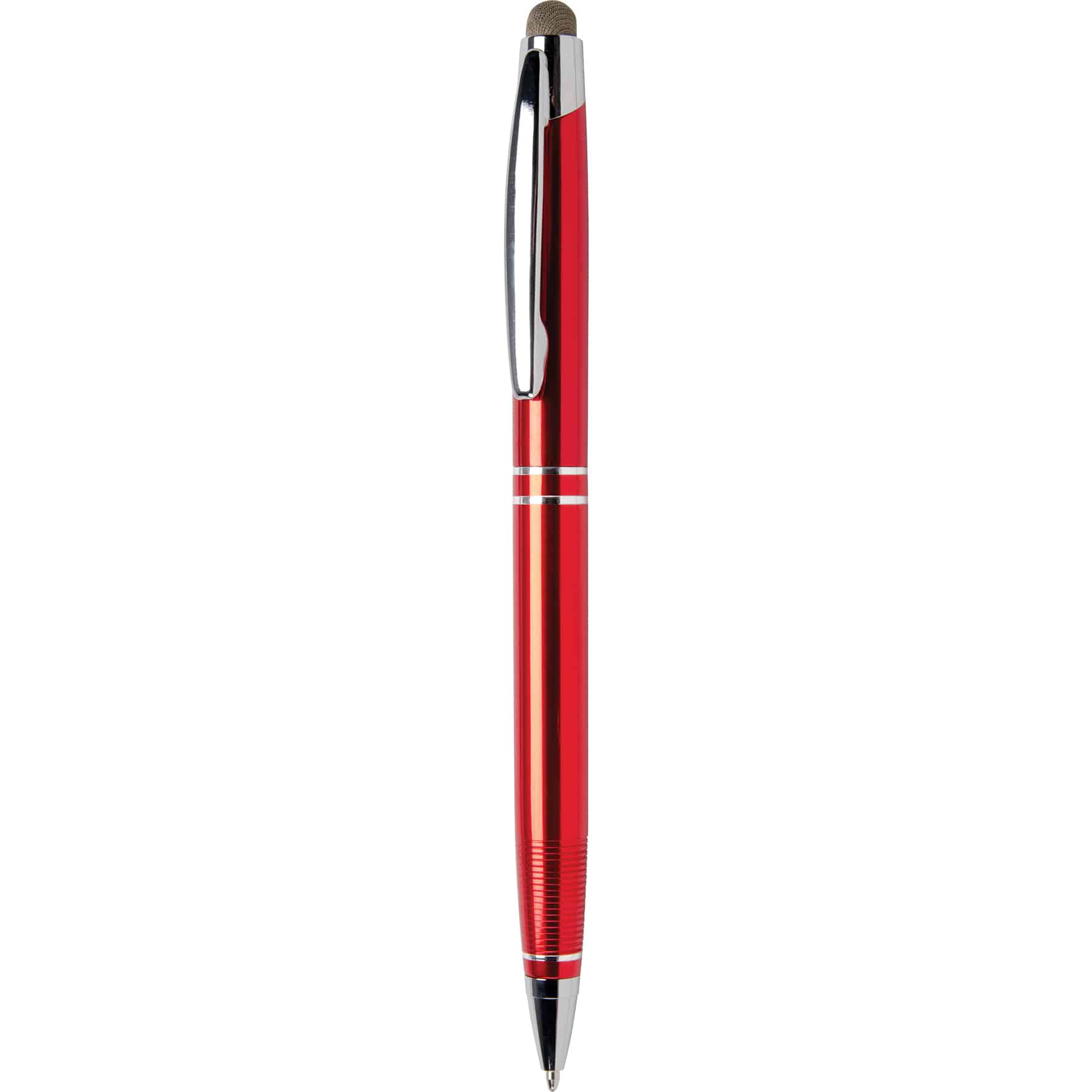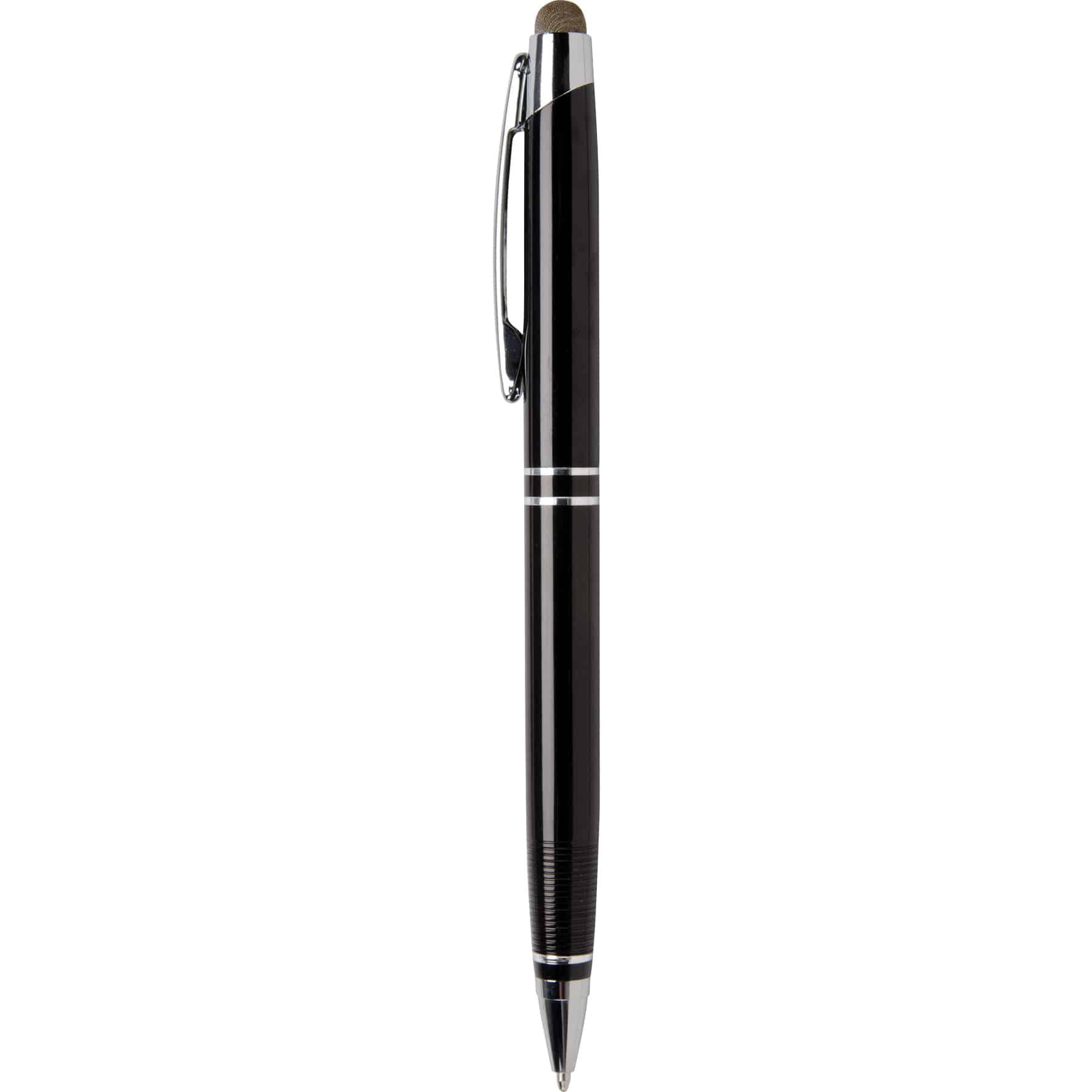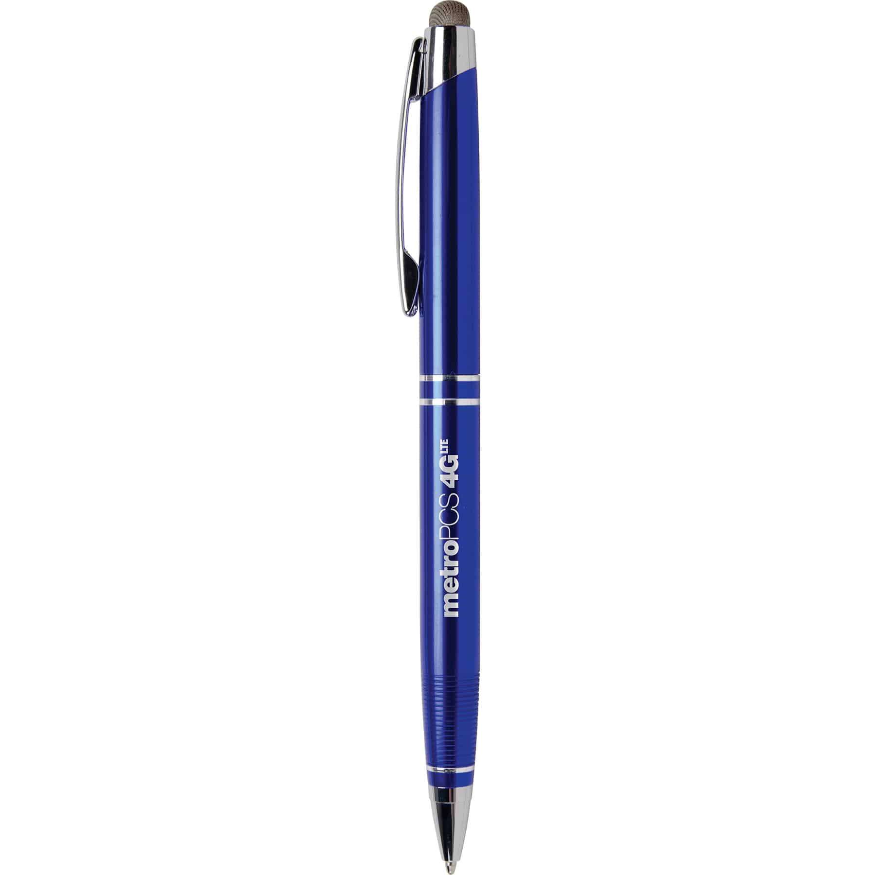 A classically styled, twist-action metal pen with microfiber mesh stylus. Deep rich colors with silver accents & etched ribbed grip create a sophisticated look with a stylus is designed for increased connectivty with all touch screen devices. Features super smooth bold black ink. Complies with Prop 65. 5.4″ L x 0.39″ Diameter